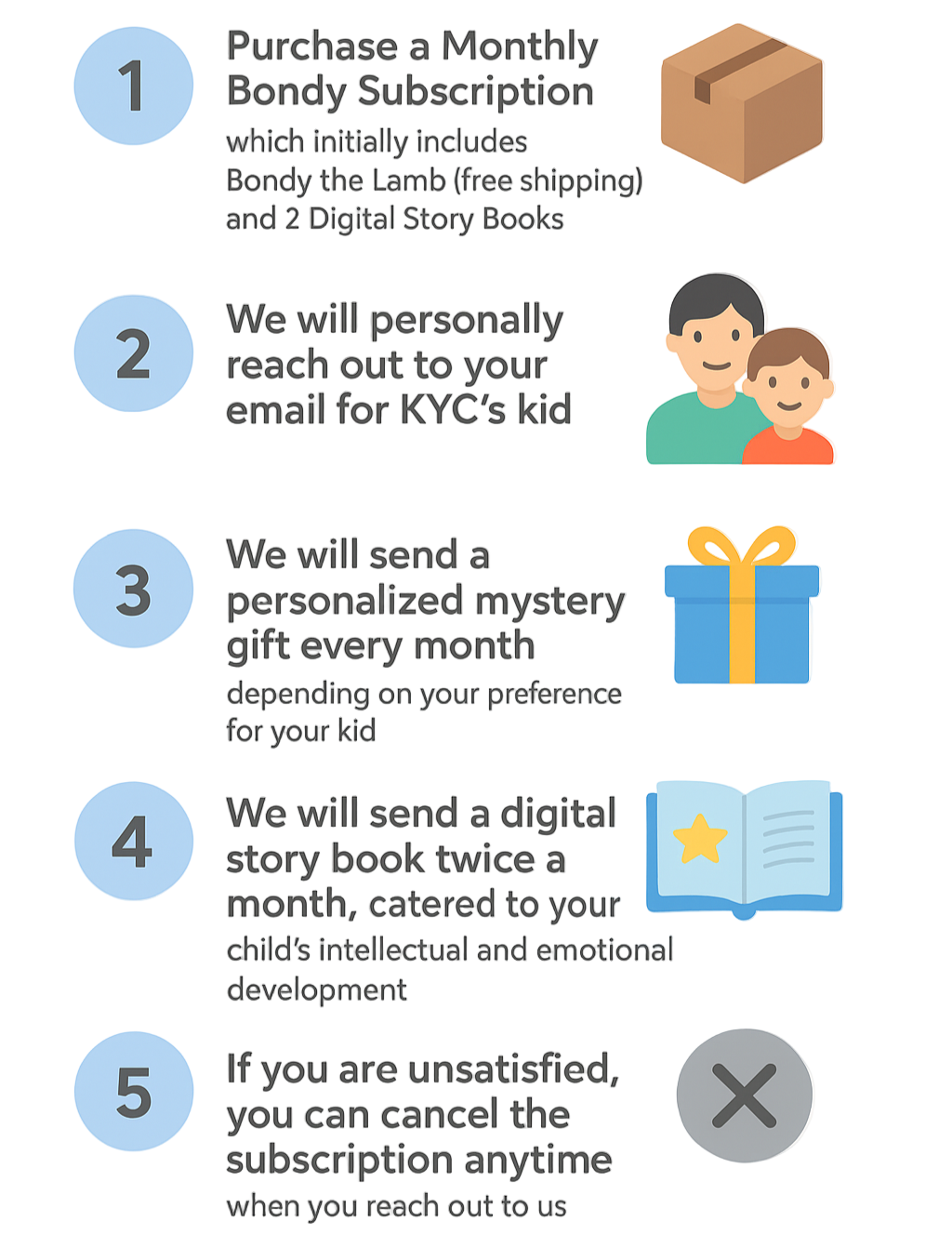 A simple 5-step guide showing exactly how the Bondy Subscription works — from your first purchase to monthly personalized gifts, digital storybooks, and easy cancellation